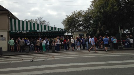 Waarom, vroeg ik me af? Niet dus vanwege de hoge kwaliteit van het gebodene. De beignets van Café du Monde waren lekker, maar de oliebollen van mijn man zijn nog veel lekkerder! Maar daarvoor staan ze niet in de rij… Bij Café du Monde, dat 24/7 (!), jaar in jaar uit geopend is, staat echter bijna permanent een lange rij wachtenden.